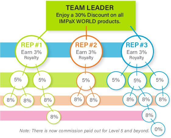 • 8% Royalty on Levels 3-4 Downline— continuing down each leg of your family of Representatives.